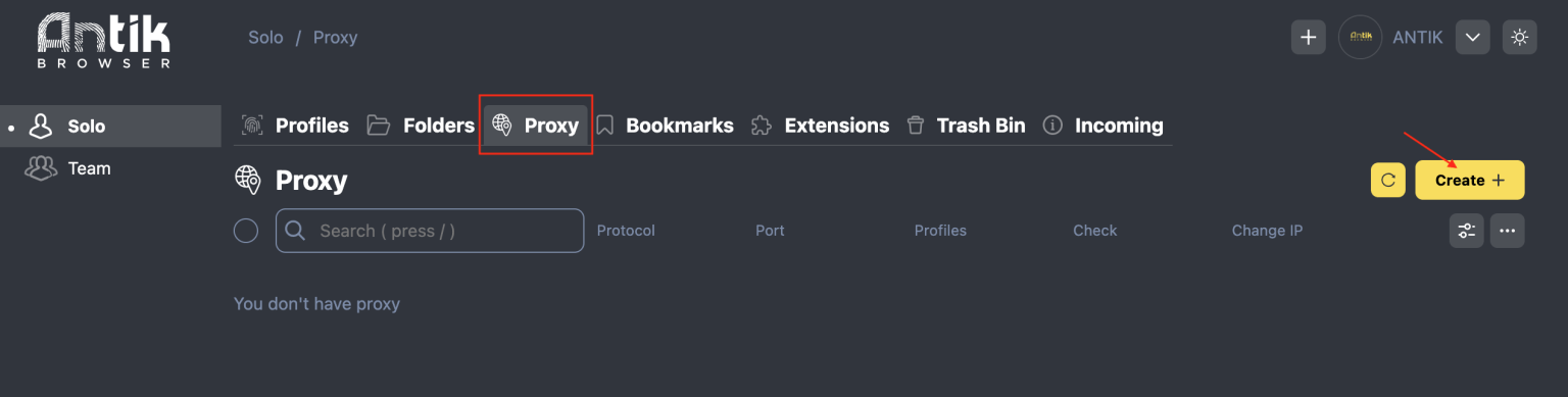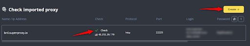 Go to the ‘Proxy’ tab and click ‘Create’ – you will be redirected to Proxy list creating menu.