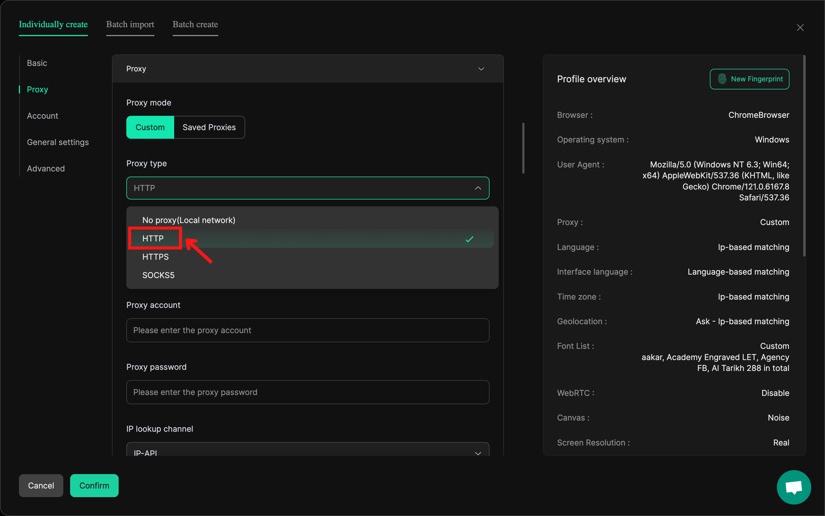 - From the ‘Proxy Type’ dropdown, select ‘HTTP’.