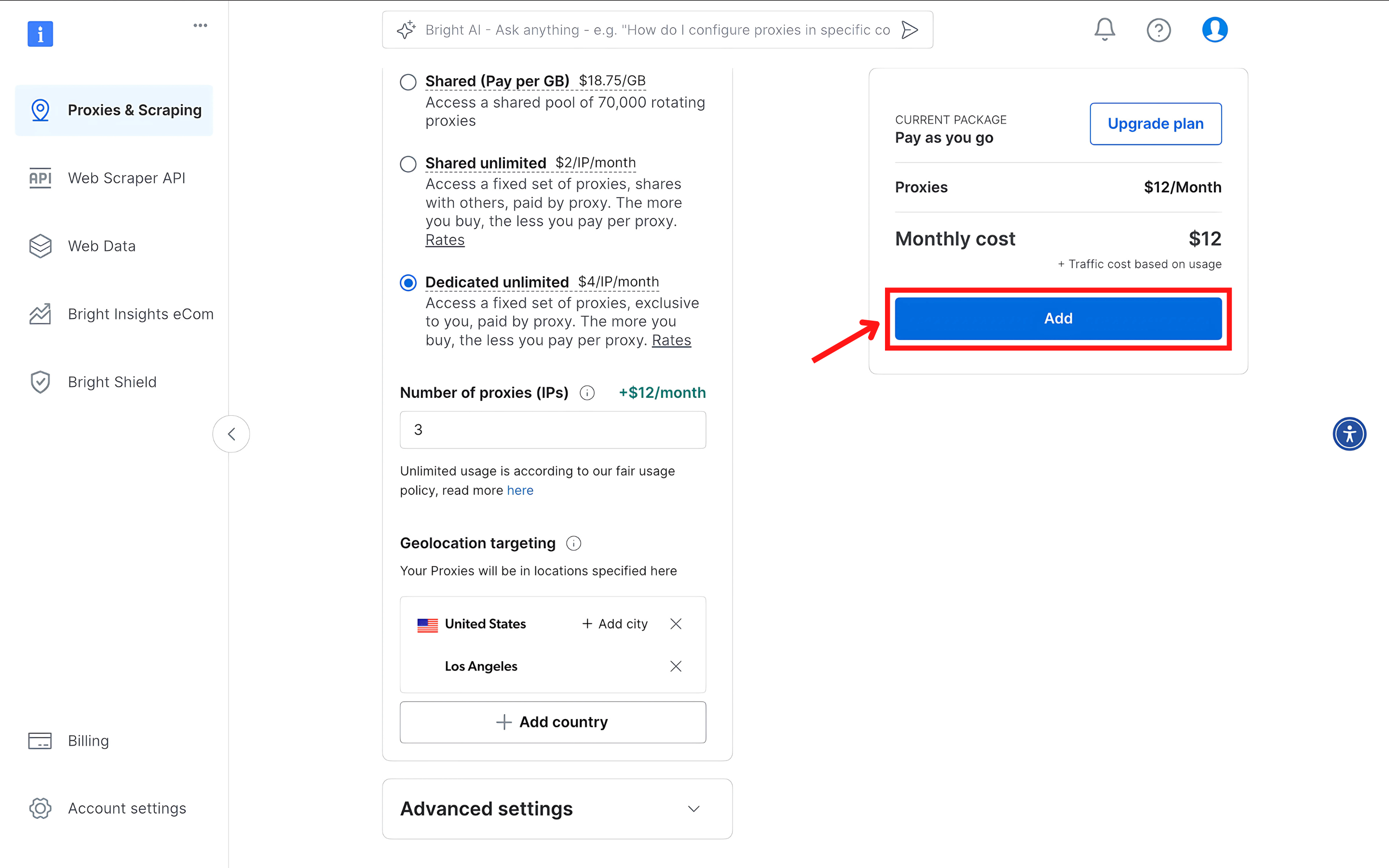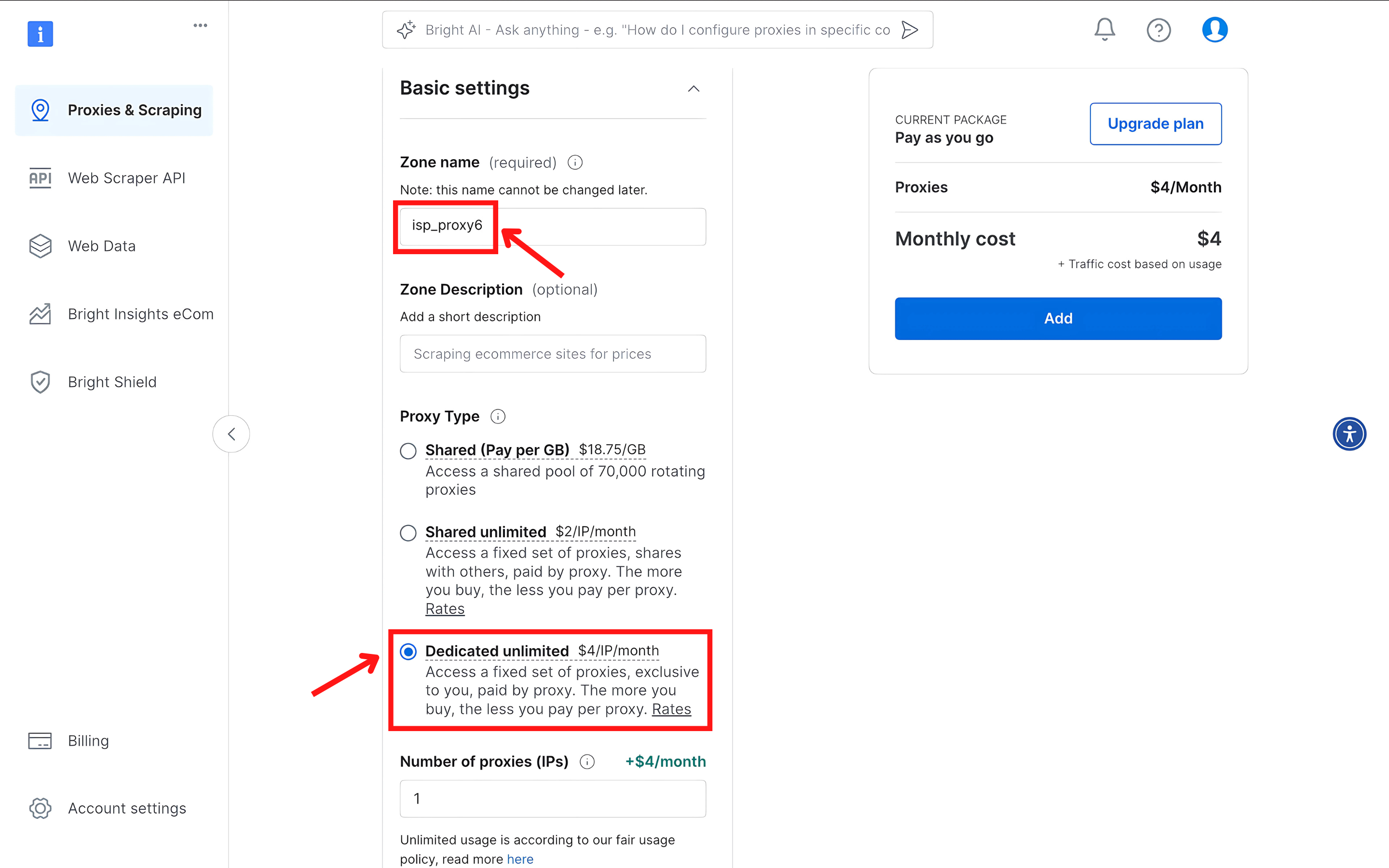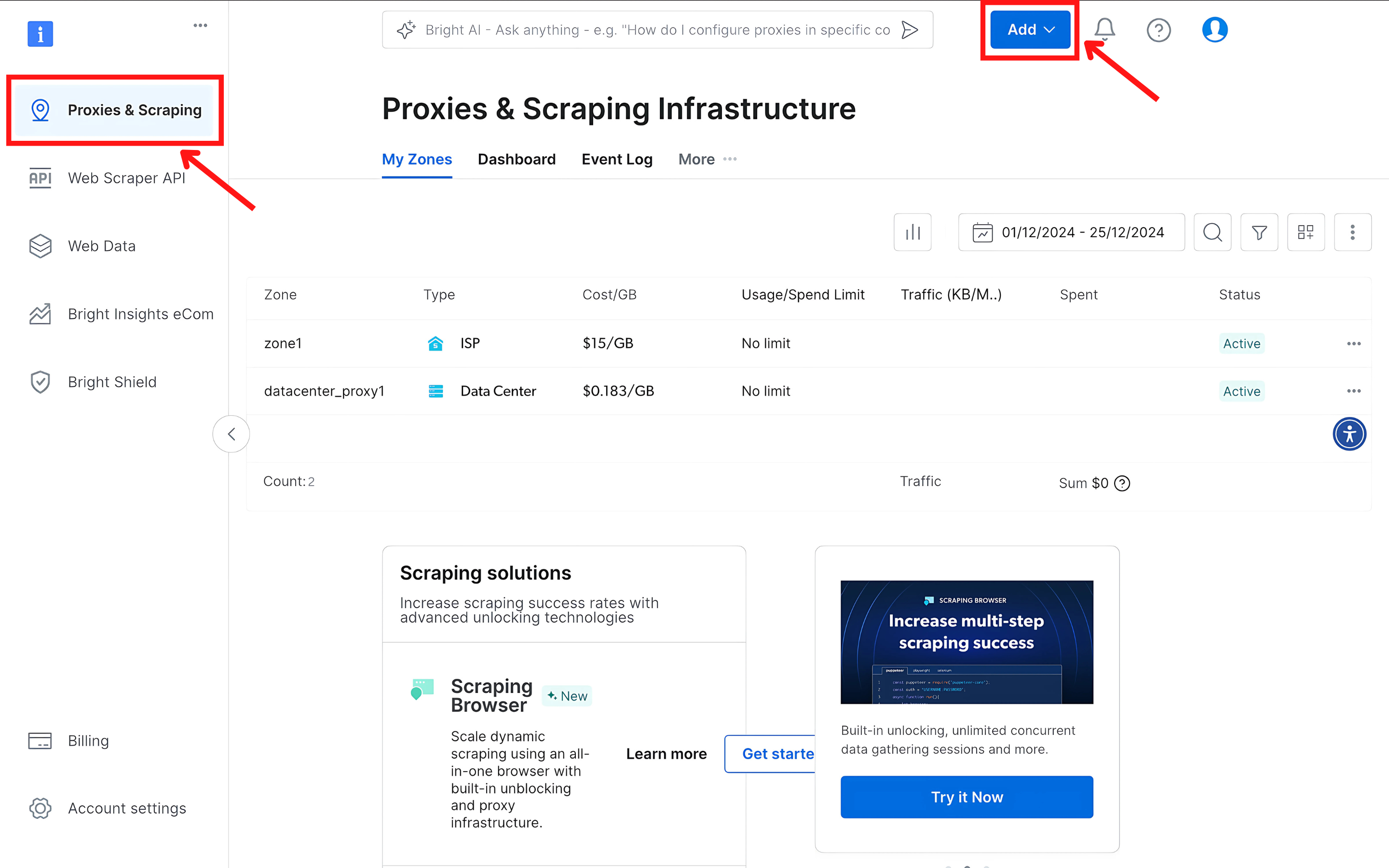 - Navigate to the “Proxy & Scraping” section and click the Add button to create a Zone.