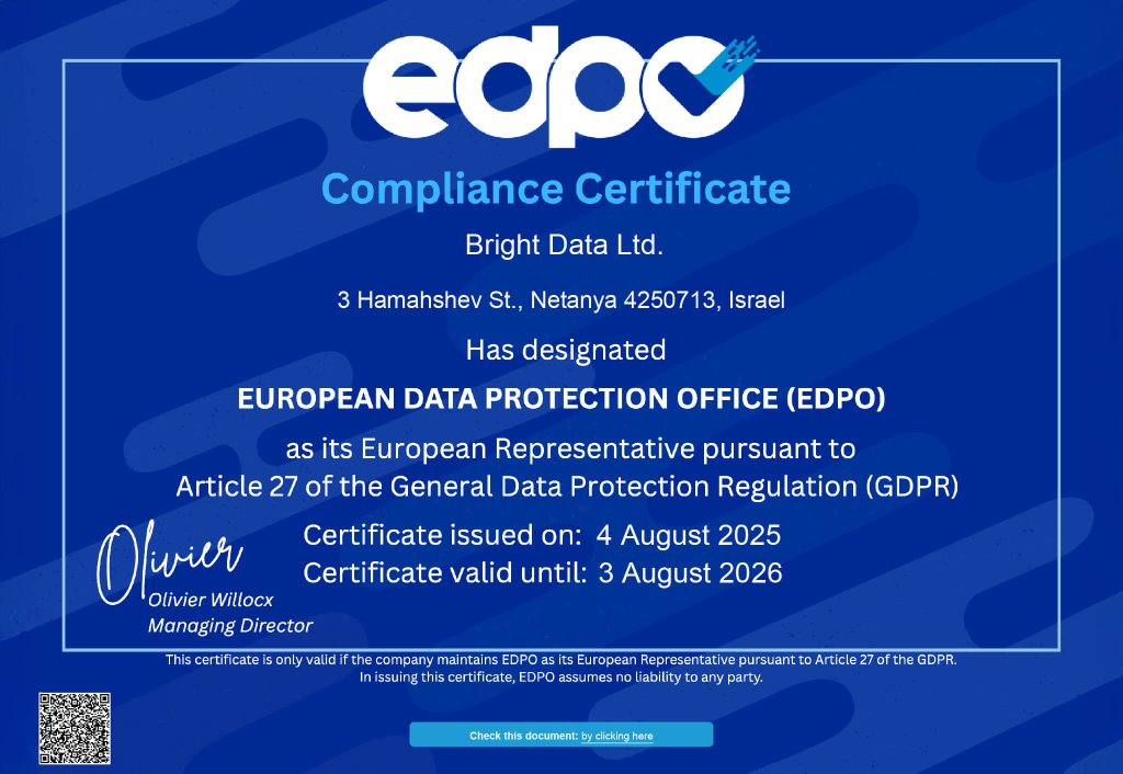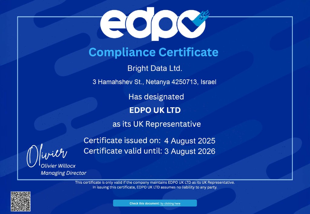 As an enthusiastic advocate of internet security and privacy, Bright Data understands the importance of providing data subjects with greater control on their privacy and data. Therefore, we have taken considerable efforts to ensure that our privacy practices comply with data protection laws, including the GDPR and CCPA, and the industry’s best practices regarding, among other things, respecting data subjects’ requests to exercise their rights. We are constantly examining applicable legal developments as well as the relevant provisions of the GDPR and CCPA in order to develop tools for our customers’ privacy-compliant use of our services.