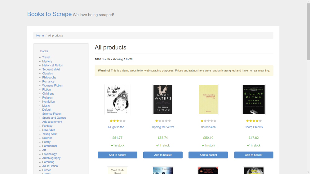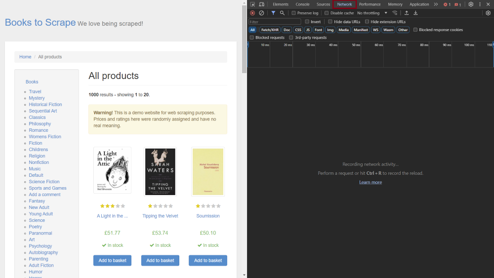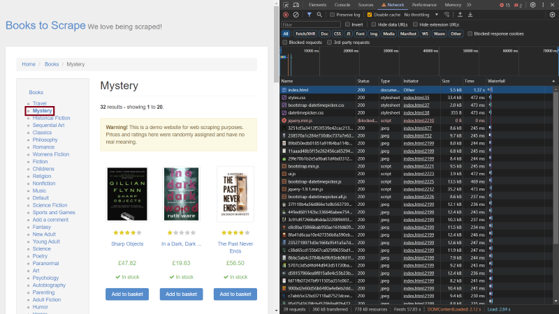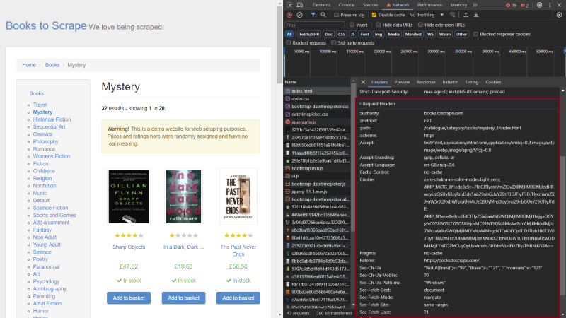 To demonstrate how you can optimize your HTTP headers, let’s make a Python request to scrape books in the mystery category from the dummy e-commerce website Books to Scrape. Before doing this, you need to get HTTP headers from your browser’s developer tools.