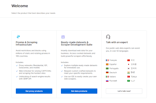 Brighdata provide 4 different types of proxies, here we use ISP proxy as an example, click ISP proxies and get started.