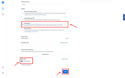 Make sure to include your targeted domains or select the “All domains” , in order to target multiple sites using the same IP.