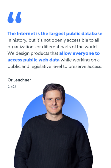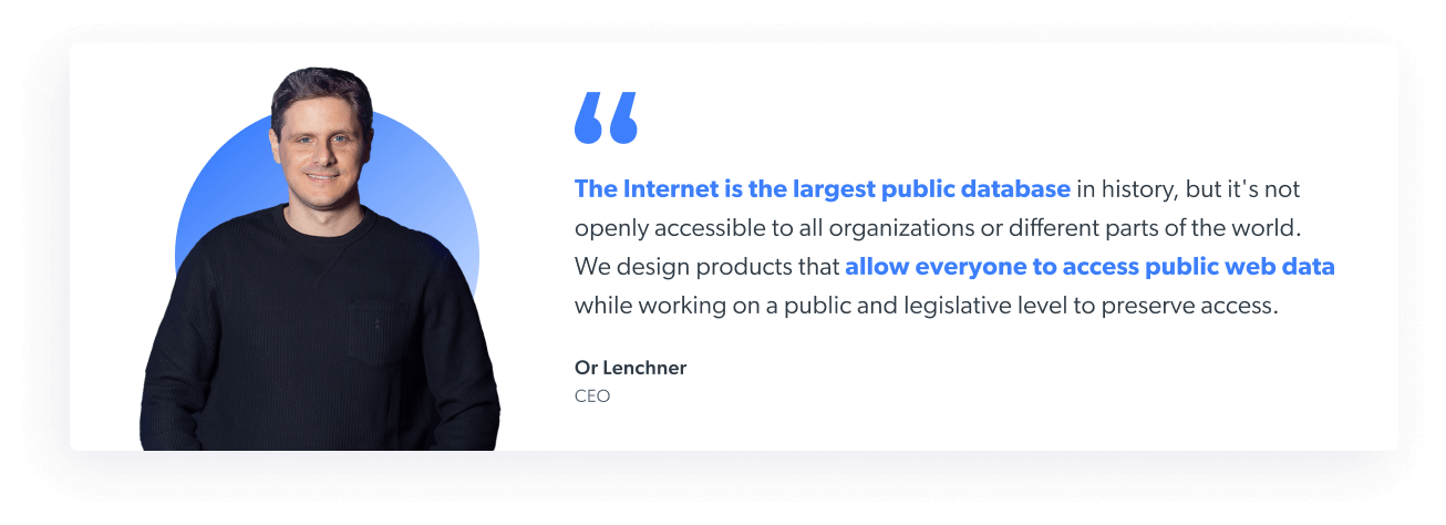 Our mission is to innovate as the ethical, responsible, and transparent leader of the web data infrastructure industry serving AI and & BI, while shaping the future of public data accessibility.