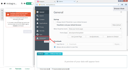 Insert a URL from which you wish to scrape data (for example, instagram.com) and press “Start project on this URL”.