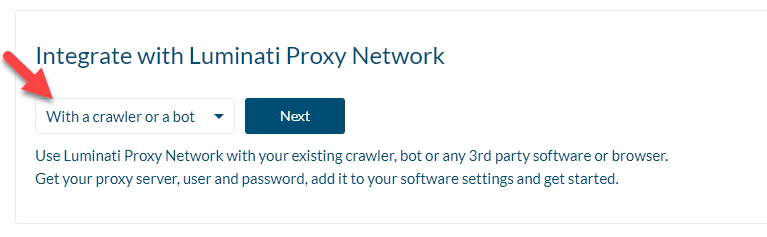 - In the Integrate with Bright Data Proxy Network section, select With a crawler or a bot option