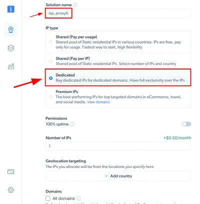 Name your solution. Set the IP type and choose the desired country and city for the IP location.